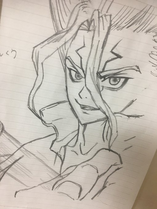 おはようございます☔ この角度難しくて2回描き直しましたやっと形になったので見てやってください(*ᴗ͈ˬᴗ͈)⁾⁾⁾ #ドクターストーン #千空 #模写 #鉛筆画 #アトリエの系譜 #みんなで楽しむTwitter展覧会 #イラスト好きさんと繋がりたい #絵描きさんと繋がりたい