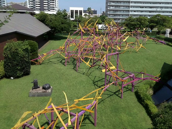 2021年、中村岳作品・上空からの全景。全長80m、高さ7mの大型作品。会場:千葉県立美術館・中庭にて #千葉県立美術館 #中之条ビエンナーレ #木津川アート #我孫子アートな散歩市 #iagawards #きゃりーぱみゅぱみゅ #ムロランアートプロジェクト #中村岳 #morueran