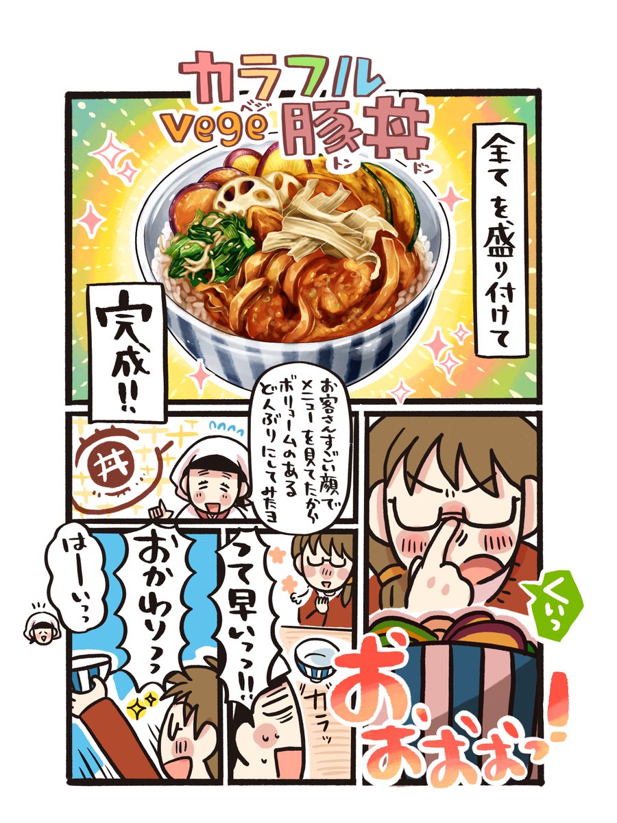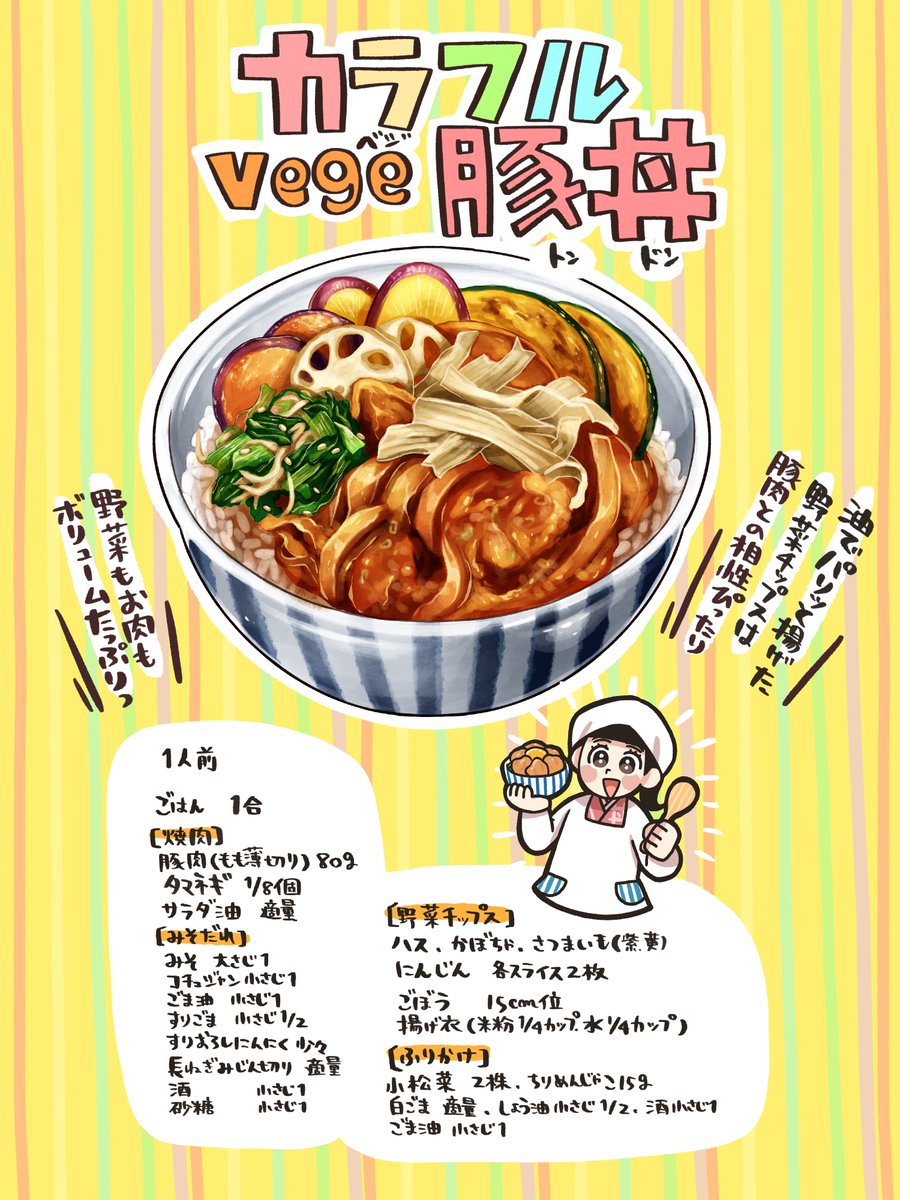いらっしゃい! 今晩の日替わりどんぶりは、#千葉 の「カラフルvege豚丼」! 油でパリッと揚げた野菜チップスは、ごま油で炒めた小松菜ふりかけや豚肉との相性も抜群。 お家でもぜひ作ってみて。 #どんぶり食堂 #農家の皆さんありがとう