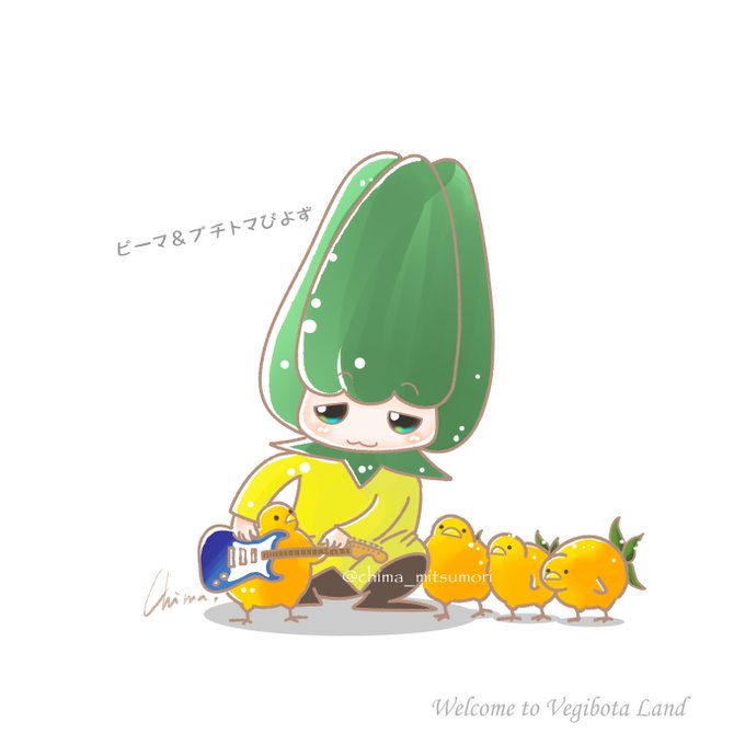 ピーマンの妖精“ピーマくん”とプチトマぴよちゃんたち “ロックの日”のギターは楽器好きのピーマがぴよちゃんに用意してあげたもの🎸 #イラスト #創作イラ #オリキャラ #オリジナルストーリー #野菜キャラ #妖精 #ベジボタランドの仲間たち #千魔箱のキャラまつり