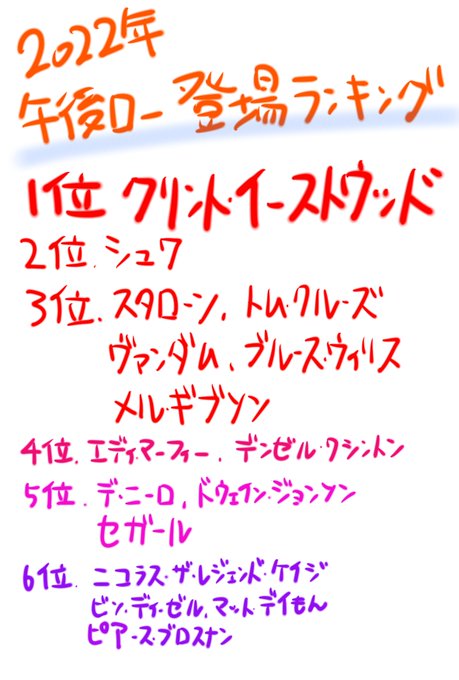 お待たせしました! 2022年の午後ロー登場ランキングです。 クリント御大2連覇! なんだかんだと午後ロー御三家つよし! シュワ、スタローン、セガールの三人です。 新人賞はマット兄さんですね! トム・クルさんが午後ロー降臨! そしてニコラス! #午後のロードショー #午後ロー