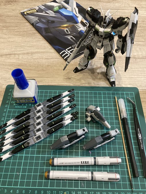 デカールワーク開始 RG特有のグレーの縁取りみたいなのは敢えて使わない方向。#午後9時からのガンプラモデラー #hiνガンダム #ガンプラの画像貼るとRTされると聞いて #ガンプラ #ガンダム