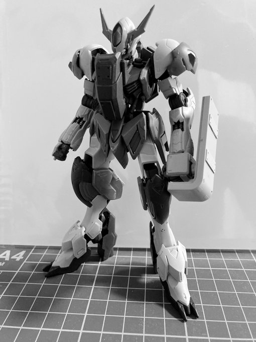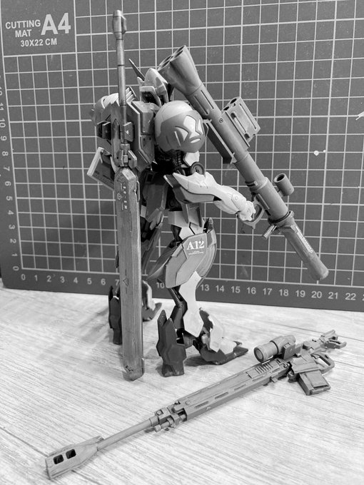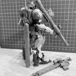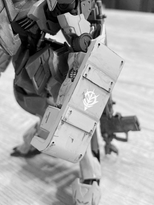 モノクロなので分かりづらいかもしれませんが、いい感じにダメージ&サビ&汚しができたと思います。#午後9時からのガンプラモデラー #俺達のアナザー #ガンプラの画像貼るとRTされると聞いて #ガンプラ