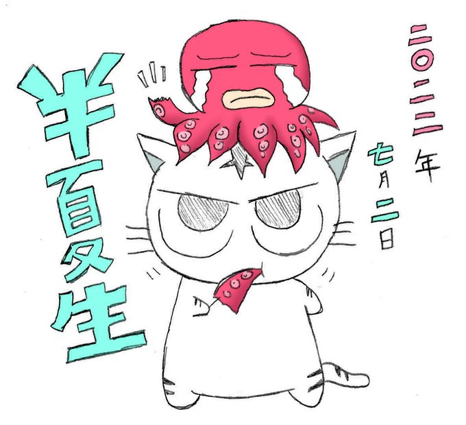よき夜を 2022-07-02 半夏生 mikepunch.net/2022-07-02/ @mikepunch358より #mikepunch #猫のイラスト #酷暑 #ご自愛を #半夏生 #タコの日 #おにぎり猫のものがたり