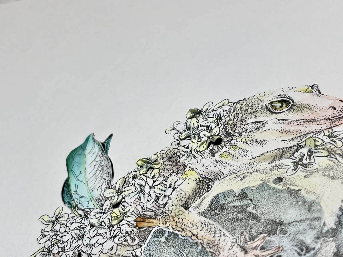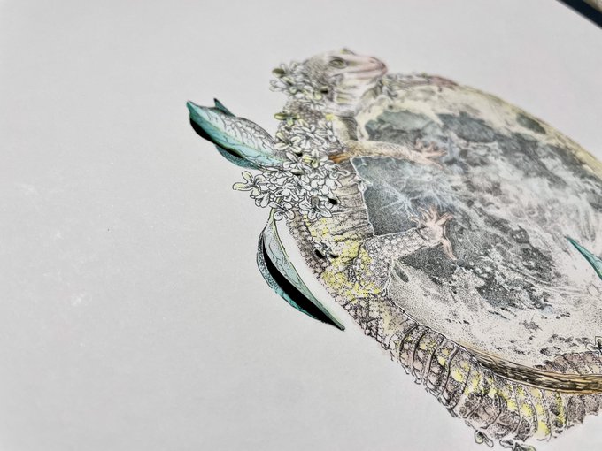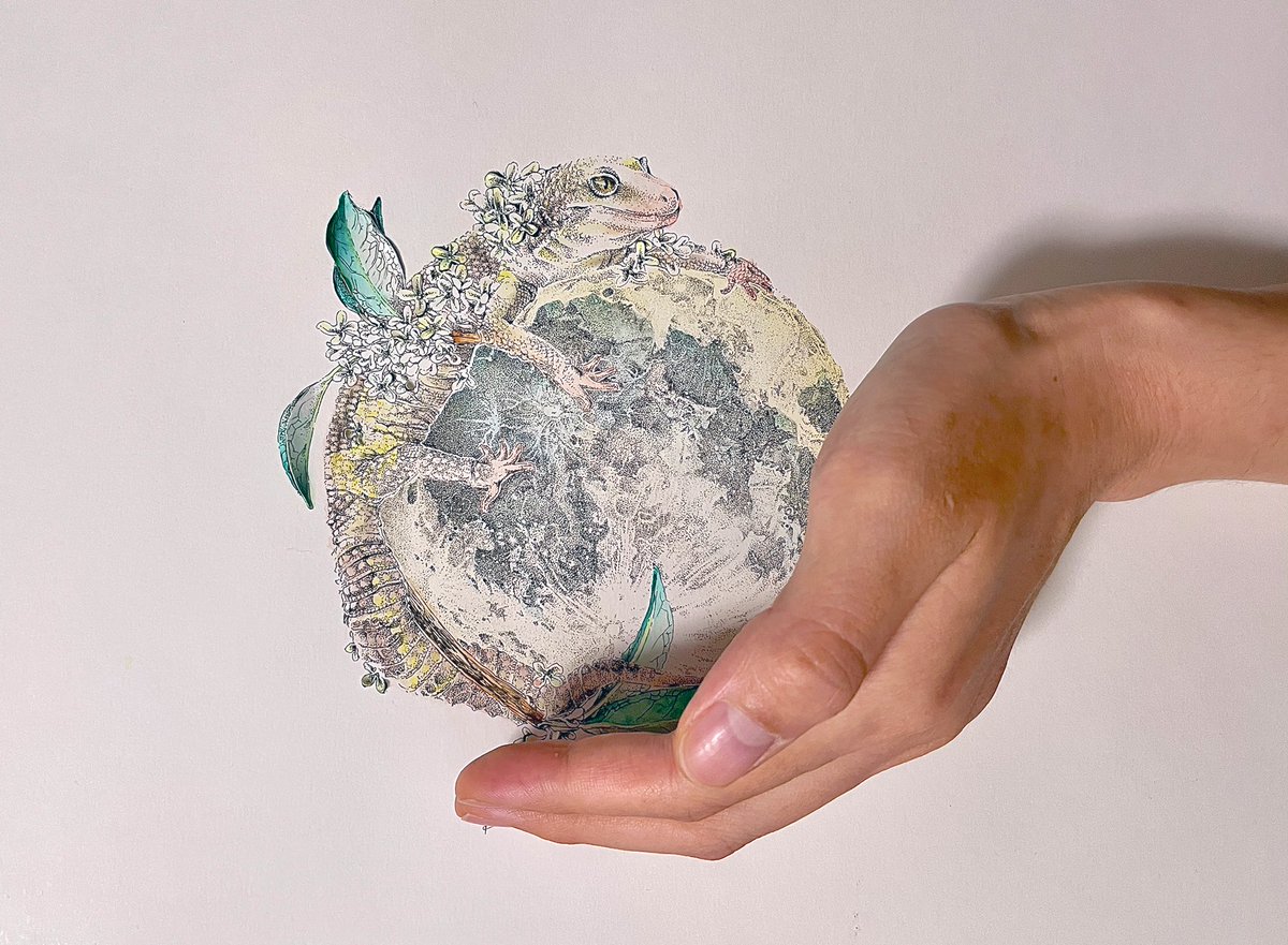 ■満月 ■銀木犀:花言葉「初恋」 ■ヒョウモントカゲモドキ ペン画 / 0.03+0.02 点描 #半立体作品 No.15 画面サイズでおおよそ23×23cm この作品の物語⤵︎ instagram.com/p/CVsH3yIvVPh/… 制作過程1/2⤵︎(2/2はリプにて) #ハロウィンイラスト展示会2021 twitter.com/kuretax/status…