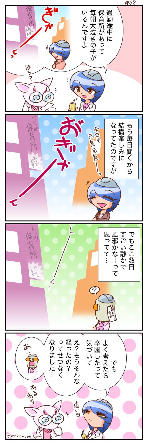 おー元気だねー!って毎朝思っていたら、ある日突然何も聞こえてこなくて 「あれ?風邪?それとも慣れた?」って思ったのです …ところで保育所でも卒「園」であってるのでしょうか?卒「所」? 謎だ! 今までの作品はこちらから→ameblo.jp/menon-blog/ #卒園 #4コマ #漫画が読めるハッシュタグ