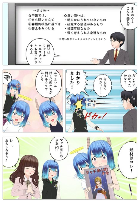 「20,000字なんて書けません!」p27 昔、ブログでリサーチクエスチョン(問い)について説明しているのがあった(daigakusei-skill.com/v5ma)。 #卒論 #卒業論文 #卒論指導 #卒論ゼミ #comipo #漫画 #漫画が読めるハッシュタグ #漫画好きと繋がりたい #創作 #pixiv