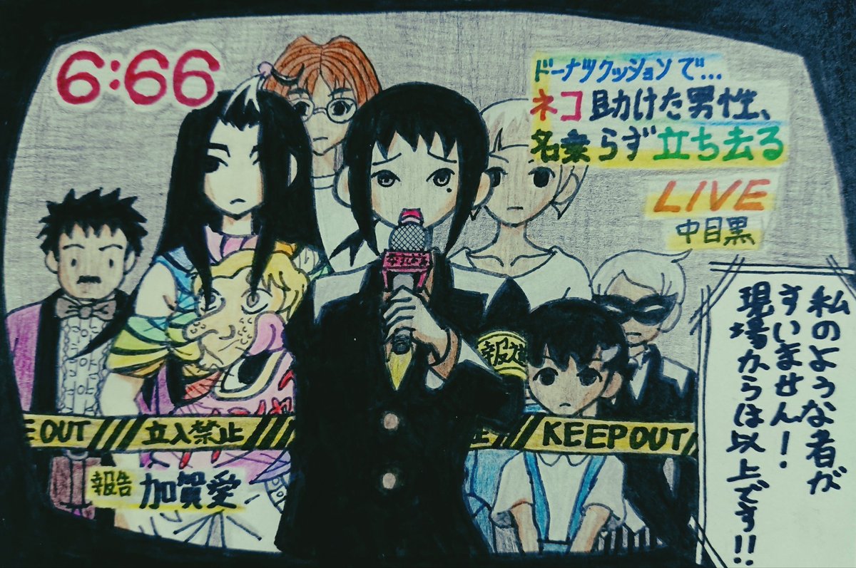 久米田クロニクル。筧亜美さん、都加祷さん、青山君×芳賀君、変なシャツの女性がちらちら見ているという事件現場からの中継。 #かくしごと #シブヤニアファミリー #さよなら絶望先生 #ルートパラダイス #南国アイスホッケー部 #かってに改蔵 #せかどろ #久米田康治ファンアート
