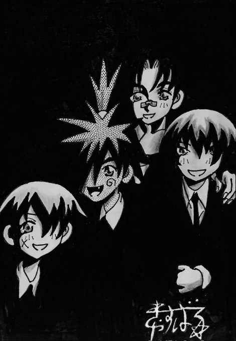 THE BEATLESのパロで、坂本冬馬君×ポカポカ×蘭堂月斗パイセン×勝改蔵パイセン。 #育ってダーリン #太陽の戦士ポカポカ #南国アイスホッケー部 #かってに改蔵 #久米田康治ファンアート