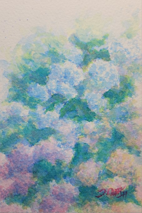 #あなたの紫陽花見せてください せっかくなのでこちらのタグ借りて再掲w 題「通り雨のあとに」 サイズ:ポストカード 使用画材:#透明水彩、水彩紙 #水彩画 #単色画 #風景画 #ワンドロ #アナログ絵 #watercolor #landscapes #art