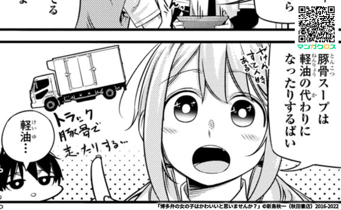 博多弁の女の子はかわいいと思いませんか?豚骨燃料回更新されてます! 福岡の車は◯◯で走る…?勉強になるかもしれない豚骨ラーメンの秘密 mangacross.jp/comics/hakatab… #マンガクロス #博多弁の女の子