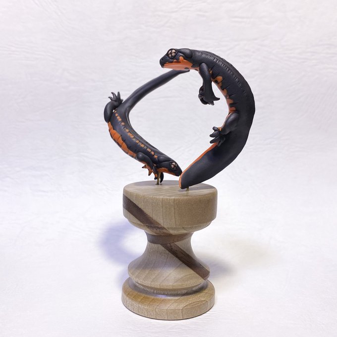 てことで新モノ「まわるアカハライモリ」 水中を泳ぐような動きのあるポーズに仕上げました。 個体差もいろんな角度から見てもらえたらと思います。 週末10/1,2の博物ふぇすてぃばるにて展示販売します。 #博物ふぇす #博物ふぇすてぃばる