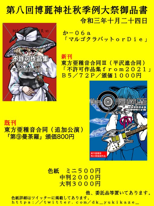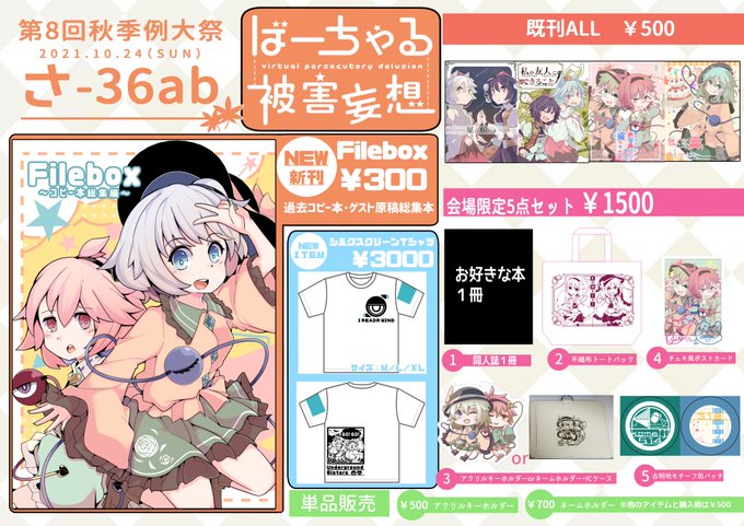 10月24日(日)秋例大祭のお品書きです! 今回の新作は新刊とTシャツになります。 当日は『さ-36ab ばーちゃる被害妄想』にてお待ちしておりまーす。 宜しくお願いしまーす! #秋例大祭 #博麗神社秋季例大祭