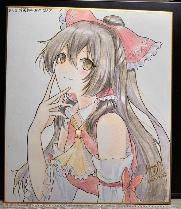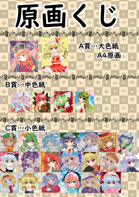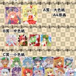 全ちゃん【@sugokunemuiyo88】が合同くじのお品書き作ってくれました~! C賞のカラー小色紙は半分、D賞のモノクロ小色紙はお好きなイラスト選択制です☺ 是非引きに来てくださいませ~! #お品書き #東方Project #博麗神社秋季例大祭 #コピック #アナログ