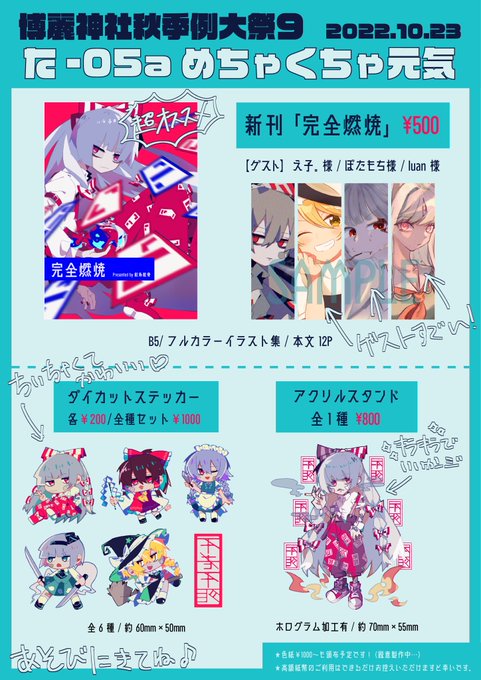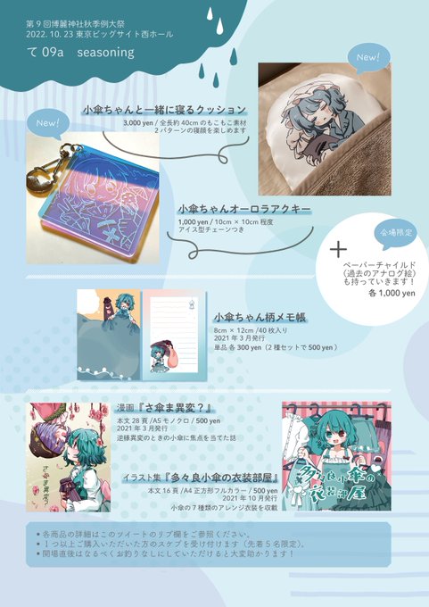 第9回博麗神社秋季例大祭@東京ビッグサイトのお品書きです☔ 色んな小傘ちゃんをぜひ見に来てください~! 詳細はリプツリーまたはpixiv(pixiv.net/artworks/10214… )をご参照ください💡 #博麗神社秋季例大祭 #秋季例大祭
