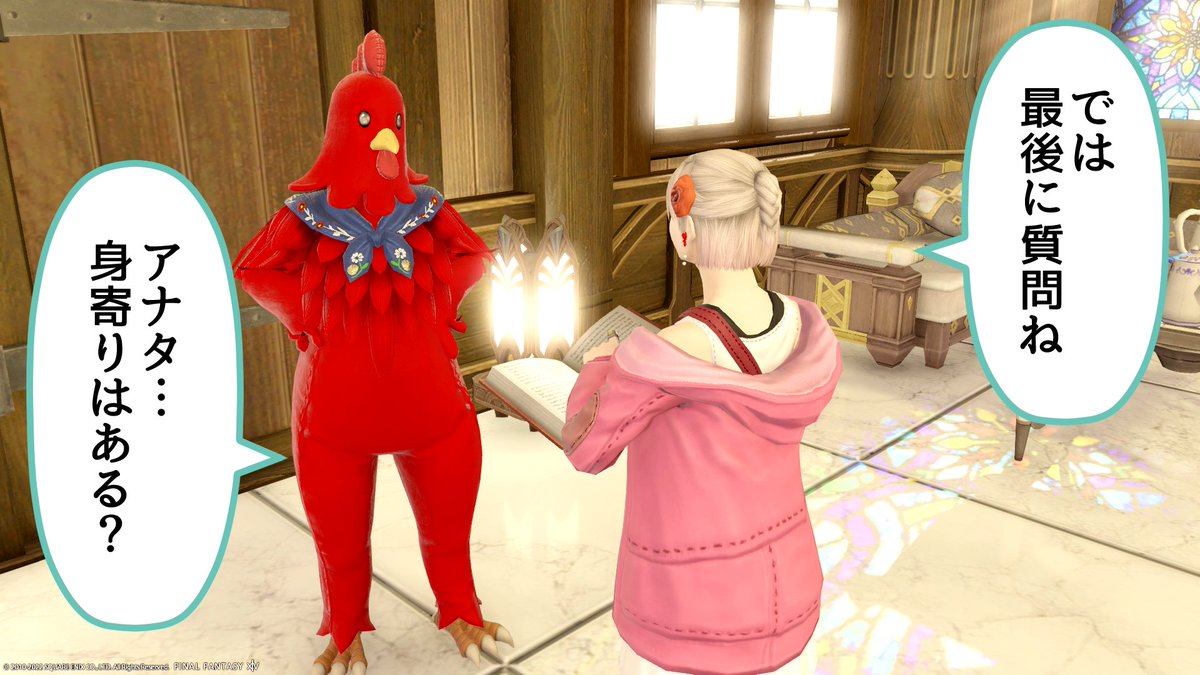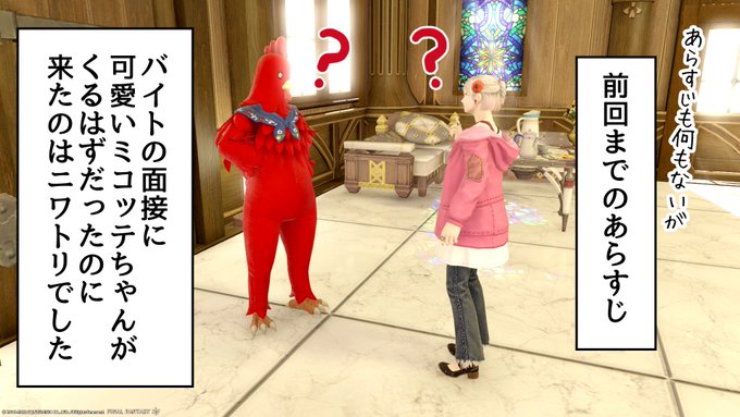 おはようございます٩(ˊᗜˋ*)و✨ とある日の日記…かな? \4コマ/ 「ニワトリスーツ」※敬称略 #占いリリーコーラル #FF14 #おはララ #おはミコ #おはミド twitter.com/shacho_09/stat…