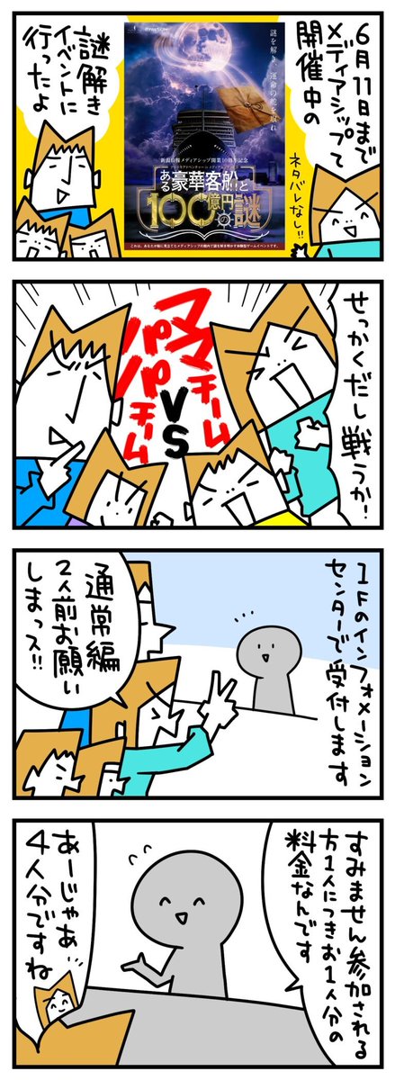 謎解きしてたきた🤔 前編 6/11までだから急いで🏃 後編へ続く #謎解き #ある豪華客船と100億円の謎 #メディアシップ #ナゾアド #新潟 #船謎 #双子 #4コマ #4コマ漫画 #漫画 #イラスト #イラストレーター #エッセイ #イラスト好きな人と繋がりたい #絵描きさんと繫がりたい #漫画が読めるハッシュタグ