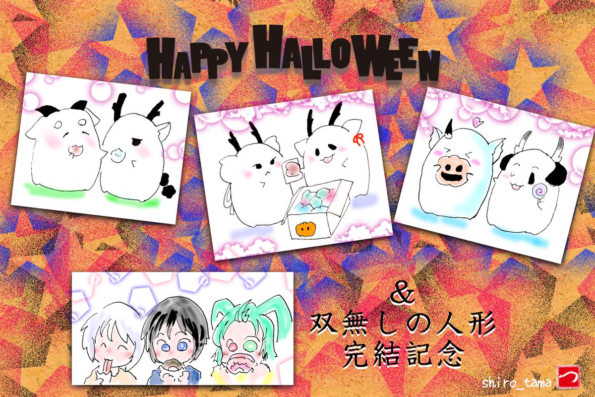 はろうぃん間に合わせファンアート。 龍王さまたちと双子ちゃん+1 2部でセリフのなかったラピスは 大きくしてみた。 #隣神ちゃんが心配 #双無しの人形 #いたずらしてもいいからお菓子あげる #次はちちさまたちも描いてみたい twitter.com/shiro_tama/sta…