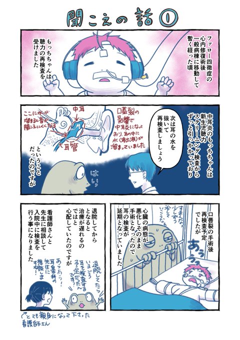 うちの子の場合漫画 ファロー四徴症の根治術後、入院中の出来事です。しばらく耳の事に関して漫画を描きます。 口蓋裂手術前の難聴はよくある事でいずれば自然と良くなると思っていました。 私たち家族の体験談として読んで頂けると嬉しいです🙇♀️ #難聴 #口唇口蓋裂 #漫画が読めるハッシュタグ