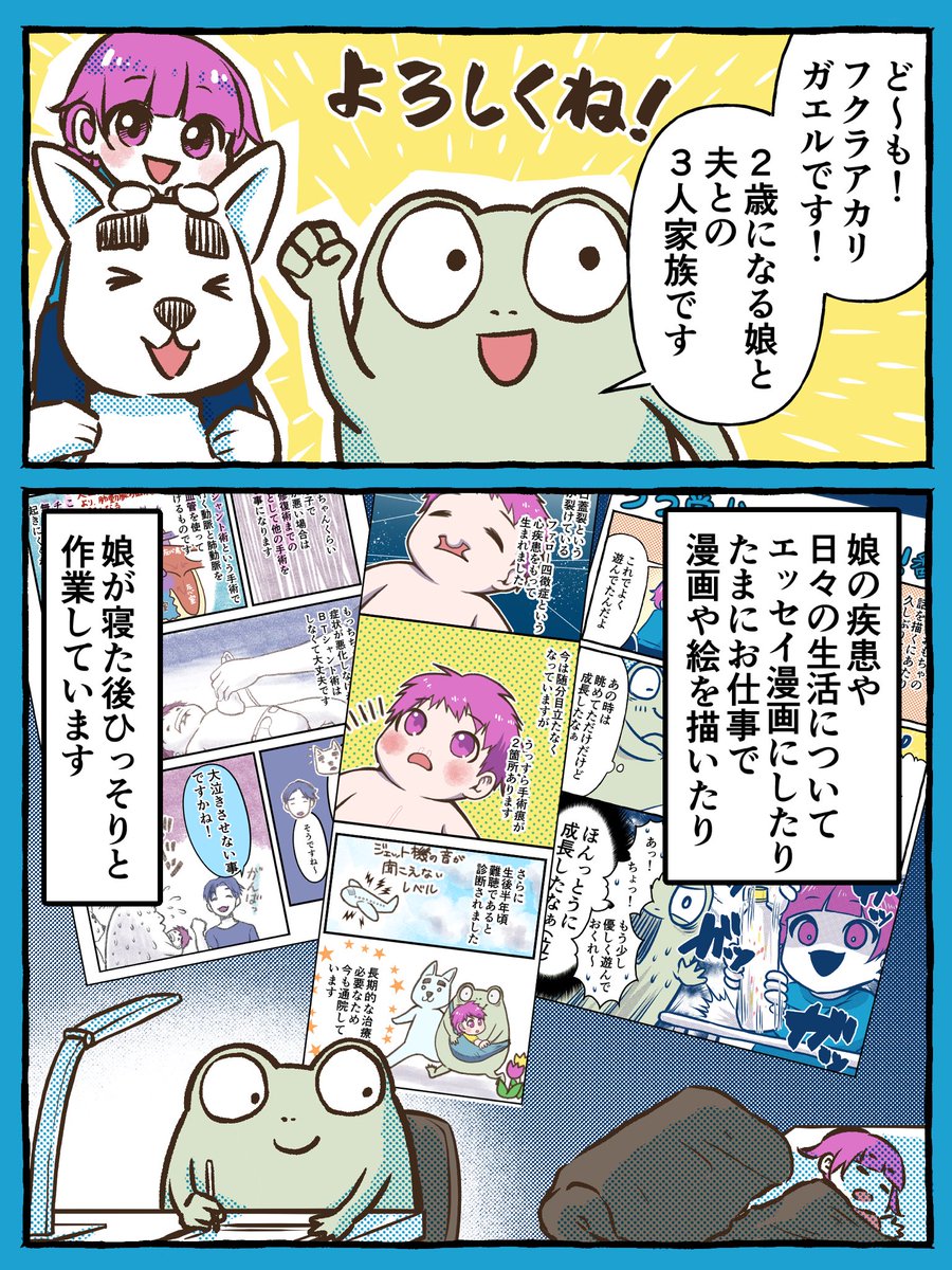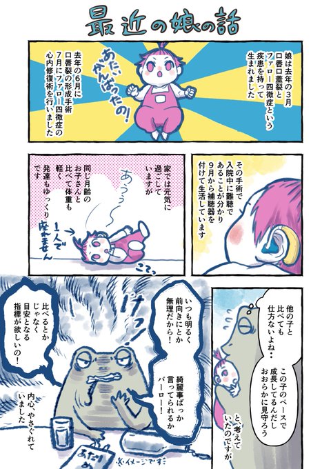 #4月になったのでフォロワーさんに自己紹介しようぜ 自己紹介というか娘の疾患の説明漫画です💦 本人は美味しい食べ物と旅行サイトを見て架空の旅行計画を立てるのが好きです よろしくお願いします! #漫画が読めるハッシュタグ #口唇口蓋裂 #ファロー四徴症 #難聴 (1/2)