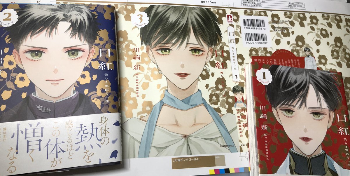 「口紅 美しき軍医の一生」3巻の書影が出ています。 特典情報など詳細を含めたお知らせはまた後日にしますので、その時に拡散などよろしくお願いいたします! とりあえずデザインが素敵なので見て〜〜😭 #口紅_美しき軍医の一生 #口紅軍医