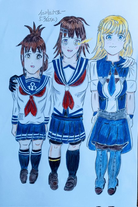 #艦これ版深夜の真剣お絵描き60分一本勝負 #艦これ版真剣お絵描き60分一本勝負_20230225 #古鷹 #電 #レンジャー 日付け変わりましたが、進水日を迎えた古鷹さん、電ちゃん、レンジャーさんの3人です。 外国艦娘を描いたことと、3人同時に描いたことは初めてで、少なからず疲れました