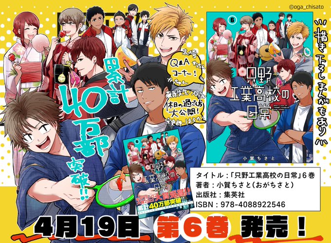 【只野工業高校の日常】第6巻 書影公開! 🎊4月19日発売予定🎊 お陰様で累計40万部突破🎉✨ 描き下ろし漫画ほか 💡赤崎・かっちゃん・やっちんへのQ&Aコーナー 💡藤原先生・スバル・宗史郎・はるかちゃんの、とある休日の1日をまるっと大公開 #只野工業高校の日常