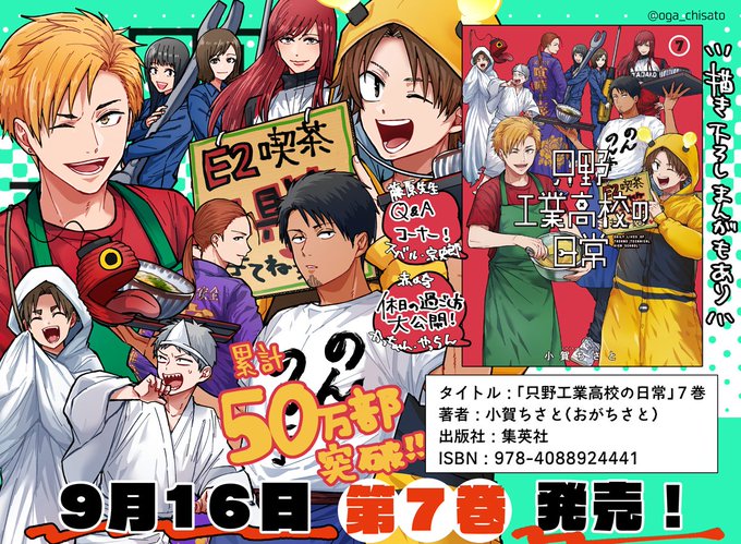 【只野工業高校の日常】第7巻 書影公開! 🎊9月16日発売予定🎊 ✨🎉ついに累計50万部突破🎉✨ 🏮たっぷり賑やか非日常文化祭!?🏮 描き下ろし漫画ほか 💡藤原先生・スバル・宗史郎へのQ&Aコーナー 💡赤崎・かっちゃん・やっちんの、とある休日の1日大公開✨ #只野工業高校の日常