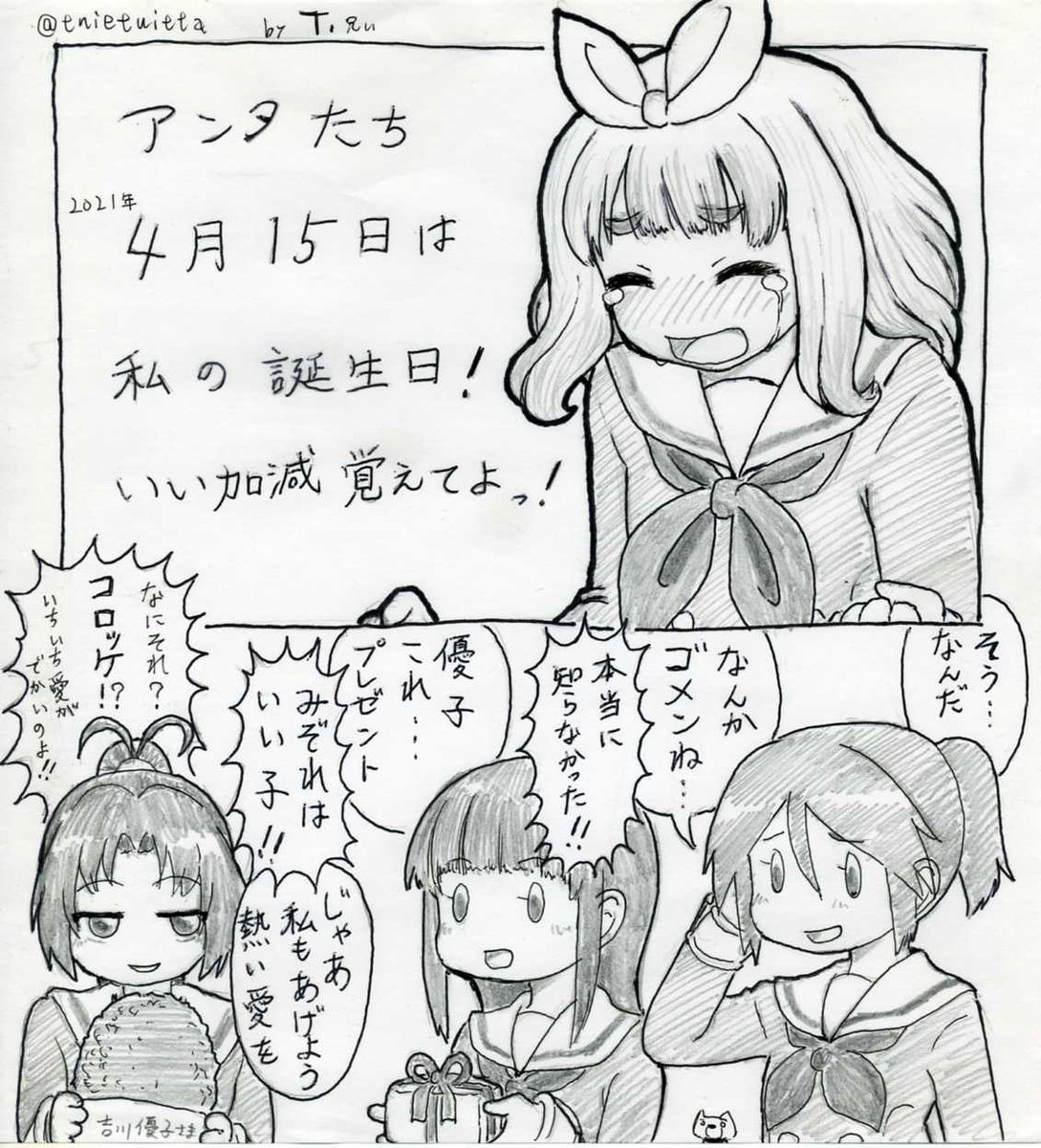 今日はカリスマ性をそのでかいリボンに秘めた部長、吉川優子さんの誕生日! いつものように過去に描いたものを貼って…あっ、 違うんですよ、 この並びはたまたまそうなっただけなんですy ヾ(´゚工゚`)シ #吉川優子生誕祭2022 #吉川優子誕生祭2022 #吉川優子生誕祭