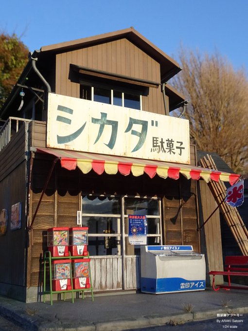 #同じ人が作っています お仕事制作ジオラマ編 (1)漫画「だがしかし」イベント展示用ジオラマ (2)リクルート「スーモ」Web CM用ジオラマ (3)仮面ライダー・セイバー撮影用ジオラマ (4) 個人依頼の廃業した店の再現ジオラマ