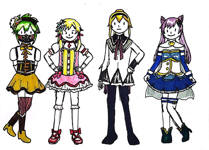 #同じ声優でキャラ晒せ #アナログイラスト CV:本多真梨子 左:AA-12(ドールズフロントライン) 上:ユリ・ザハード(神之塔) 下:霧雨魔理沙(東方ダンマクカグラ) 右:愛染明王(モンスターストライク)