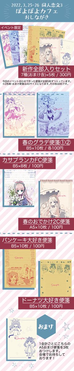 3/26のおしながきです。(ピクスク仕様なので縦長です) 通販はBOOTHを使用し、あんしんBOOTHパックでの発送となります。イベント限定セットはイベント開始直後からの公開になりますが、その他は準備出来次第の公開予定です。 よろしくお願いしますー! #同人恋文3 #同人恋文3_info