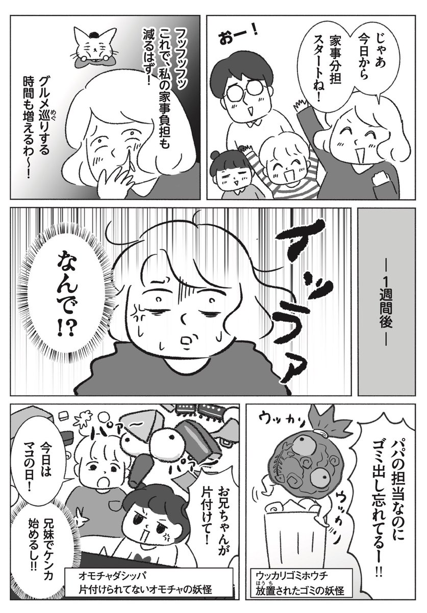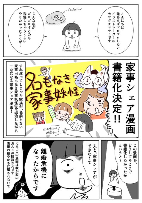 【書籍化決定〜!😭】 ワンオペ家事育児で夫とすれ違い、離婚危機になり、夫婦仲を取り戻すまでの体験談を元にした 『名もなき家事妖怪』が2023年2月8日に出版されます! 漫画+実用コラム付き📗 予約・RTしてもらえたらとっても嬉しいです🙏✨ #名もなき家事妖怪 1/3 amzn.to/3C725mK