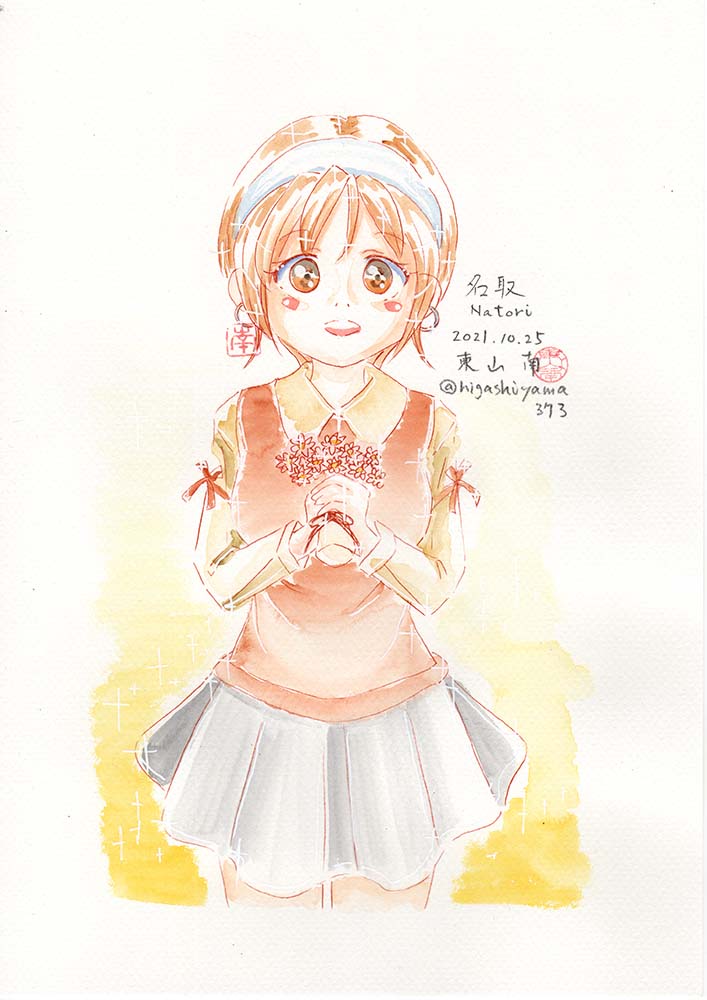 コスモスの花束を持って こちらをまっすぐ見つめている そのつぶらな瞳が キラキラ輝いていて 好き。 #名取 です #艦これ版真剣お絵描き60分一本勝負_20211025 +10m #艦これ版深夜の真剣お絵描き60分一本勝負 #艦これ #透明水彩 #ホルベイン #呉竹 #絵描きさんと繋がりたい