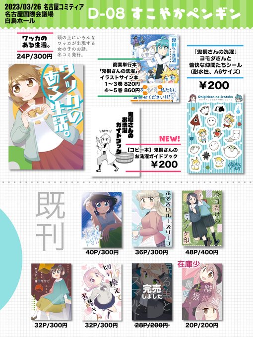 3月26日(日)名古屋コミティア62 D-08「すこやかペンギン」でサークル参加します。 名古屋は久しぶりなので全て初出です。冬コミ新刊やイラストサイン入り商業単行本全巻(5巻多め)、あと例の鬼桐さんのお洗濯ガイドブック(36P)もすこし刷って持っていきます。 #名古屋コミティア62