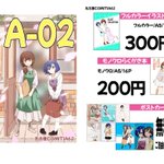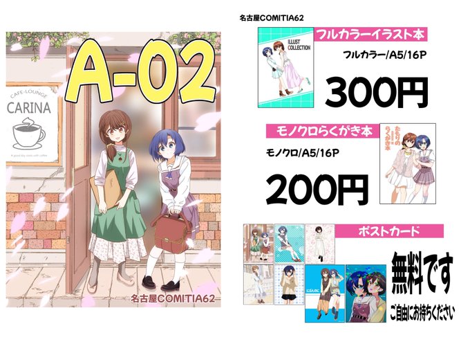 #名古屋コミティア62 看板&おしながきです👌 今回はA-02にスペースをいただいております。 新しくL判サイズのイラストカード5種類がございます! あとは 既刊のイラスト本とらくがき本とポストカード2種類を持っていきます✨ カードはすべて無料なので どうぞお気軽にお持ち帰りください〜!!