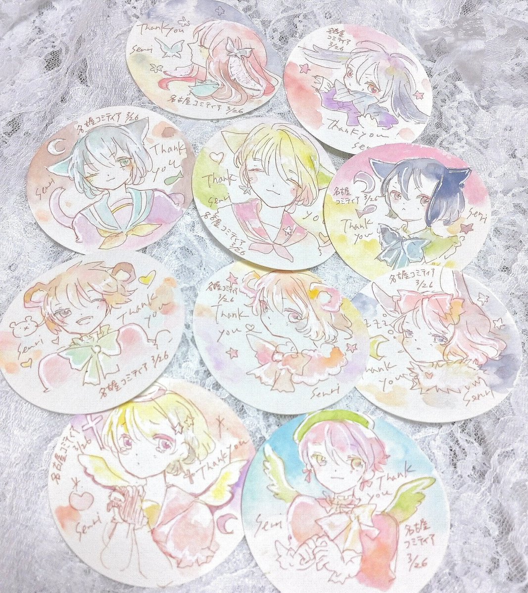 3/26(日)の名古屋コミティア、おしながきです。 【D-24】さかなのマーチ で参加します。 アナログミニ原画ももっていきます! 名ティア4年ぶりの参加です、よろしくおねがいしますっ。 #名古屋コミティア62 #名古屋コミティア62