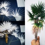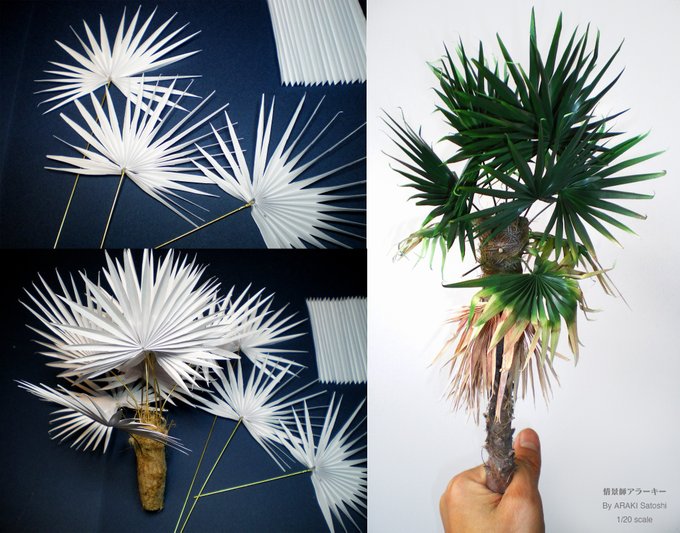 【ミニチュアシュロの木の作り方】 (1)コピー用紙を山折&谷折りでハリセンを作り、先端が尖るようにカット。 (2)扇状に広げて真鍮線を接着。 (3)繊維の荒い和紙をクルクルと巻いて幹を制作。 (2)光沢濃緑で塗装した葉+枯れた草色で塗装した葉を和紙の幹に刺して完成♬ #君たちはどう作るか
