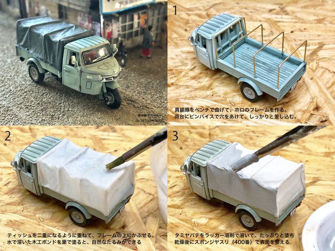 【How to 幌】 模型で布状のもの、例えば「幌」などを作る古典的方法。 「鼻セレブ」のような高級ティッシュは目が細かくて破れにくいので、Nゲージなどの小さなスケールの工作にも向いています! (コンビニに小売のポケットティッシュあり) #君たちはどう作るか