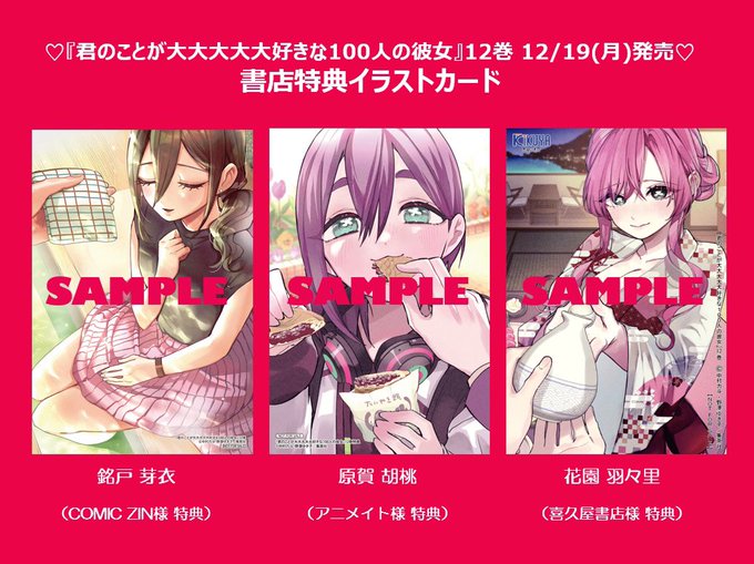 【来週12/19(月)発売!!】 『#君のことが大大大大大好きな100人の彼女』 最新12巻が来週月曜日より発売です✨ 今回もCOMIC ZINさま・アニメイトさま・喜久屋書店さまご協力のもと、イラストカードの先着特典があります! イラストは各書店様で異なり数量限定です。どうぞお手逃しなく…!📚 #100カノ