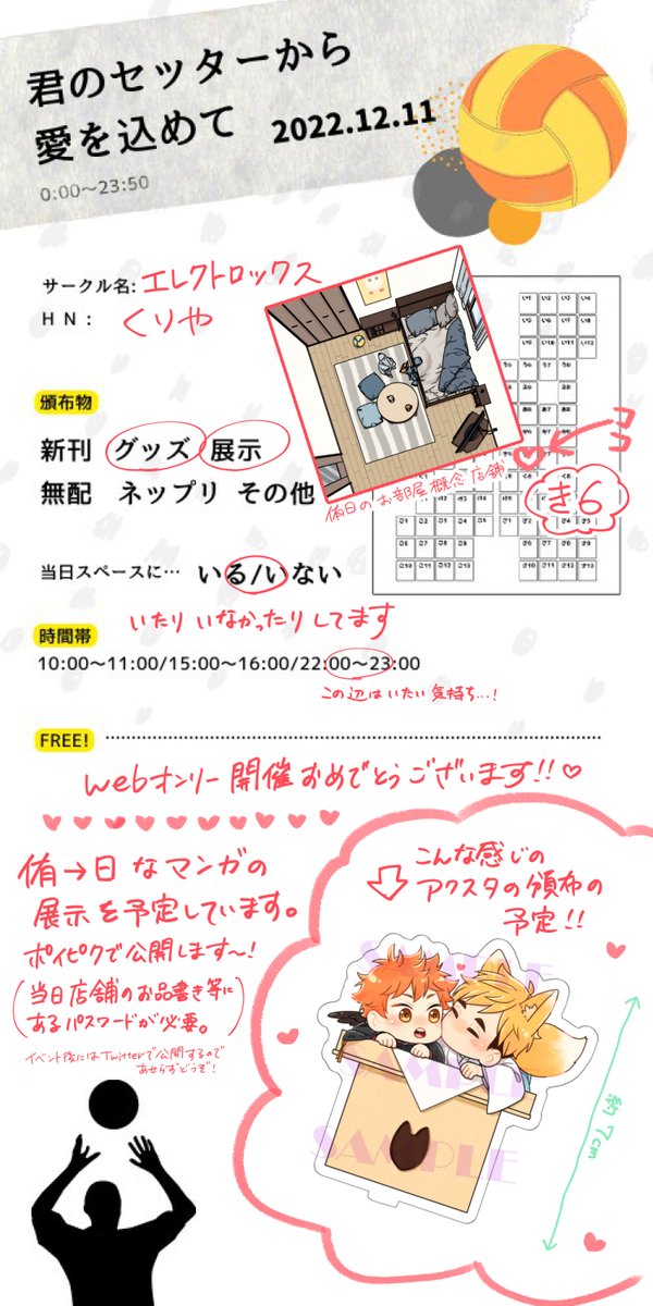 #君のセッターから愛を込めて20221211 侑日webオンリーのお品書きです! テンプレートお借りしました。ありがとうございます! アクスタはBOOTHでの頒布を予定してます。(何時になるかはまだ未定) 展示の漫画も頑張ります💪😉✌️
