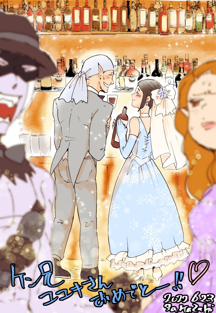 拳コユ。有志によるギルドお祝いの会にて。 カメ谷から良いカメラ借りた賢弟イチオシスナップ。 お酌して回りたいコユキちゃんと 主役は座ってなさいする拳さん じゃあ拳さんに、と花嫁にお酌されて断れない花婿の図 #吸死HL初夏のブライダルフェア