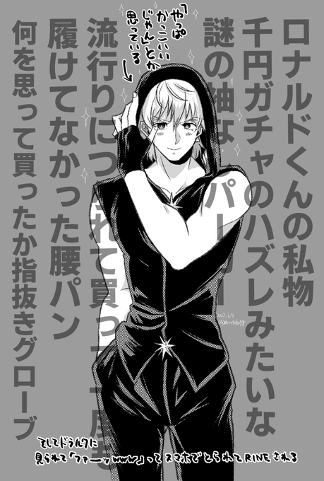 ロナルドくんの私物の1000円ガチャのハズレみたいな謎の袖なしパーカーと流行りに乗って買った腰パンと指抜きグローブを本人に着てもらいたかった絵 19巻めちゃくちゃ面白かった!!!!! #吸血鬼すぐ死ぬ19巻ムーンは昇る