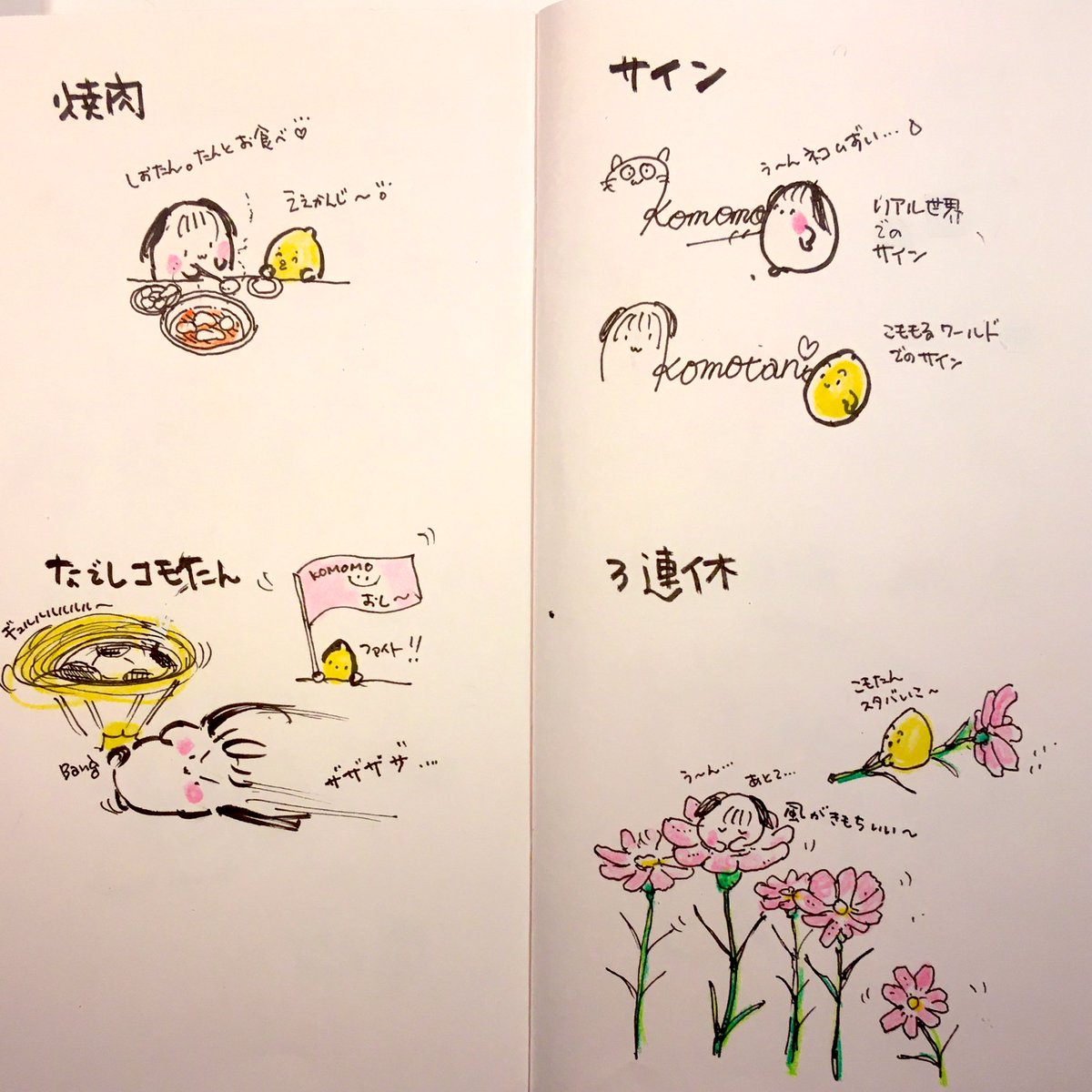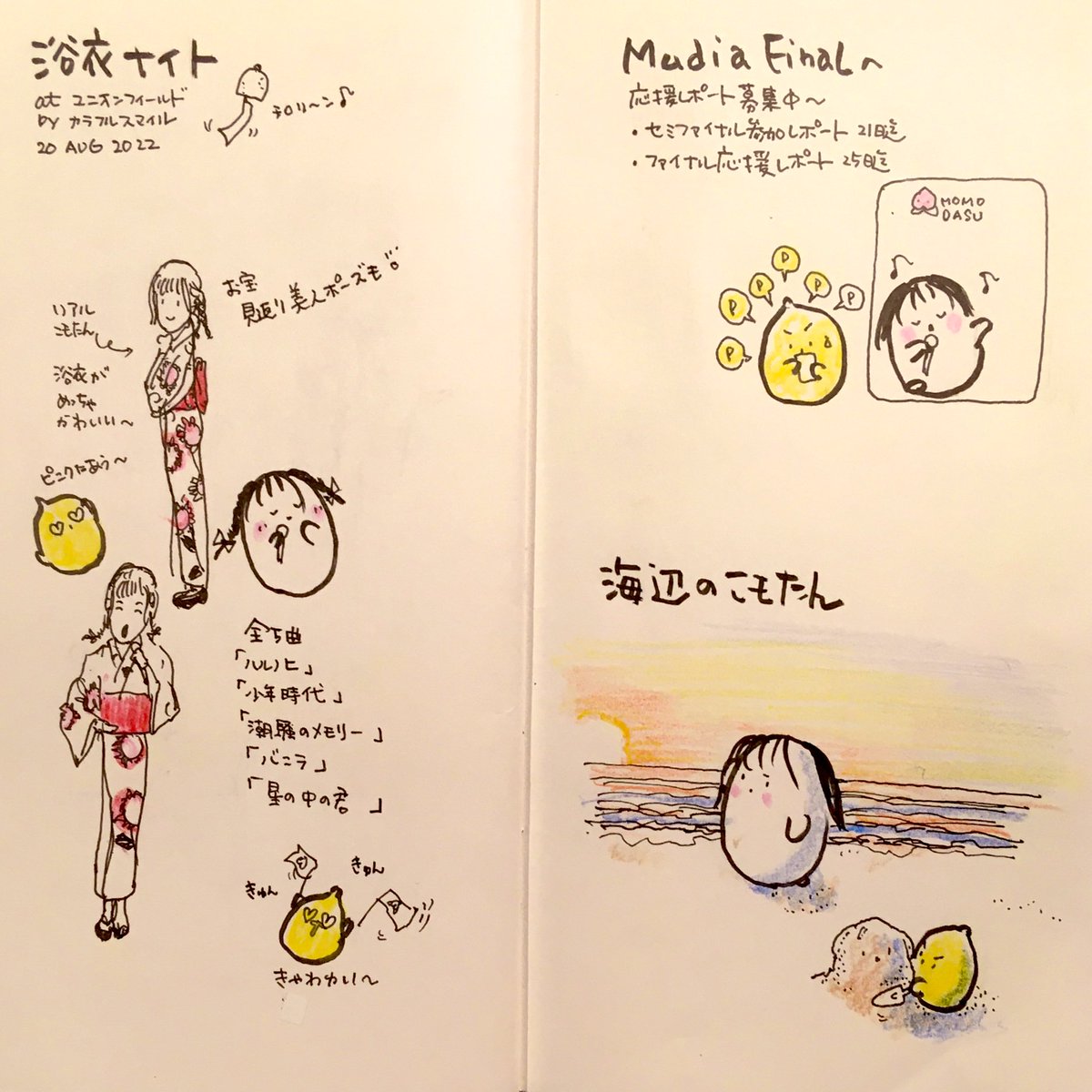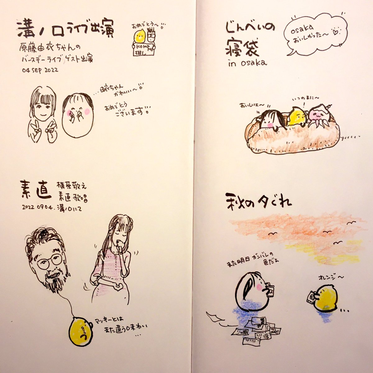 見開きアーカイブ9月前半 昨日は リアルこもたんの ワンマンライブ💖 いよいよ秋も本番ですね。 🍑使用画材 #トラベラーズノート #リフィル003 #呉竹筆ペン #コピックマルチライナー #ファーバーカステル水彩色鉛筆 #三菱鉛筆B #イラスト #よかったらお気に入り教えて下さい