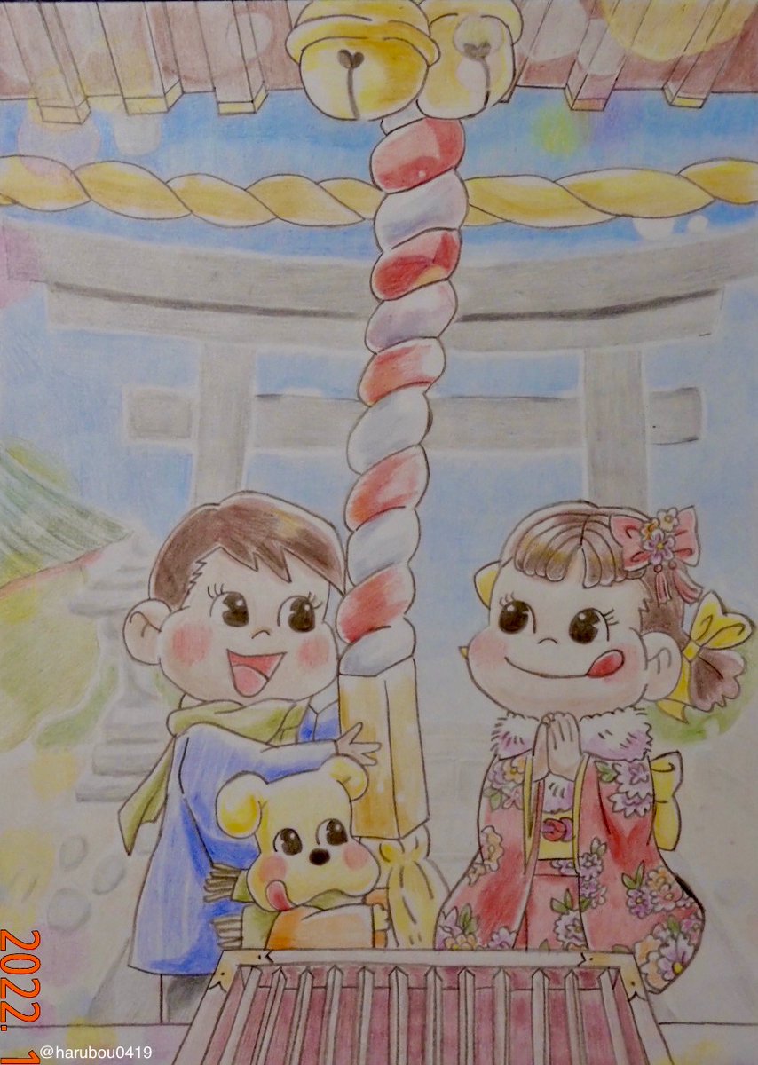 あけましておめでとうございます .:。+゚ |q(´∀`o) 今年も変わらぬお付き合いをよろしくお願いします 〜(=・ω・=) #新しいプロフィール画像 #色鉛筆画 #イラスト好きな人と繋がりたい #手描きイラスト #ペコちゃん #2022NewYear #呟き