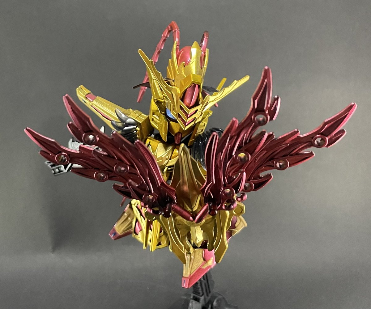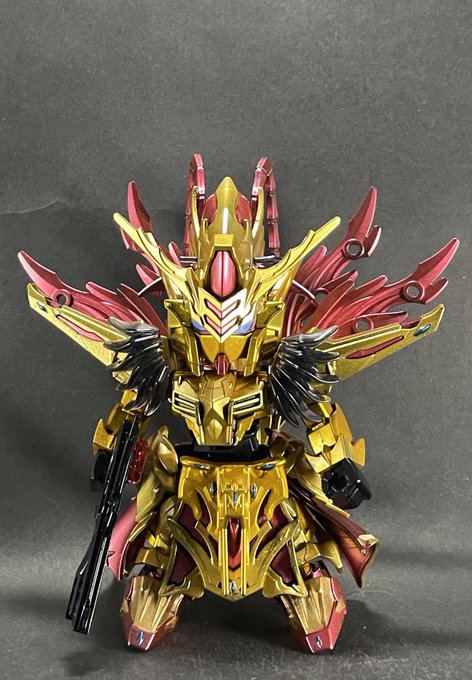 周瑜アカツキ完成しました! 写真ではわかりにくいですけど、ゴールドをスターブライトゴールドと、スターブライトゴールドの上にクリアーイエローを塗装し、2色のゴールドにしました😆 #周瑜アカツキ #三国創傑伝 #ガンプラの画像貼るとRTされると聞いて #ガンプラ好きな人と繋がりたい