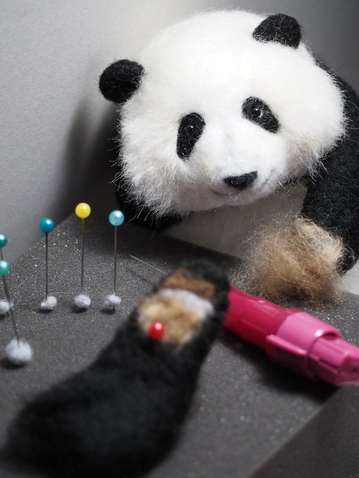 【メイキング】#羊毛和花 2 つづき 前脚の足裏に肉球や爪を入れる作業。 #和花 (#ホーファ) も興味津々で見つめている。 右の手を挙げて「好友、你好!❤」 時には🍎りんごを弟に横取りされるのを、シャッ!っと阻止する😂 #大熊猫和花 #giantpanda #HeHua #羊毛フェルト #ジャイアントパンダ twitter.com/cntoOSAKA/st…