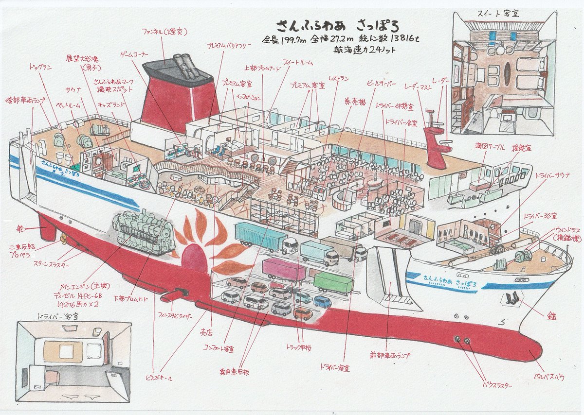 さんふらわあ誕生50周年シリーズ 昨年、乗船取材させてもらい描いた、さんふらわあ だいせつの #船体解剖図 深夜に出港する船なので一般の人が乗る機会が少なく、船も年季が入っていますが、昼間の三陸沿岸を走るので私はこの航路が大のお気に入りです #さんふらわあ50th #商船三井フェリー