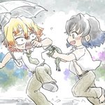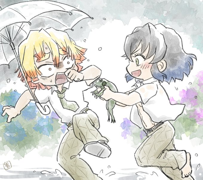 #善伊版ワンドロワンライ 開催ありがとうございます(*ˊᵕˋ*)੭ ੈ のんびりのんびり描かせていただきました お題 『傘』『カエル』より【善伊】 キ学軸 もう付き合ってるのかな善伊♪ 絶対ビーサン履いて欲しい♪