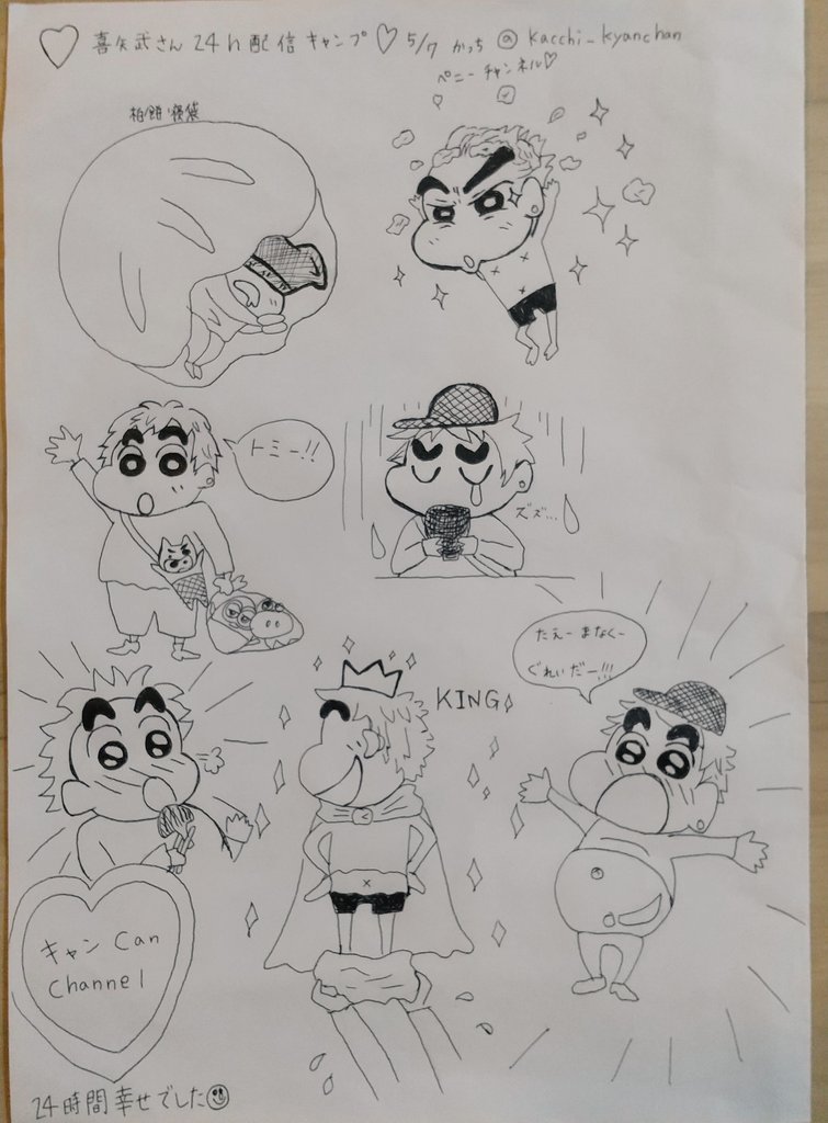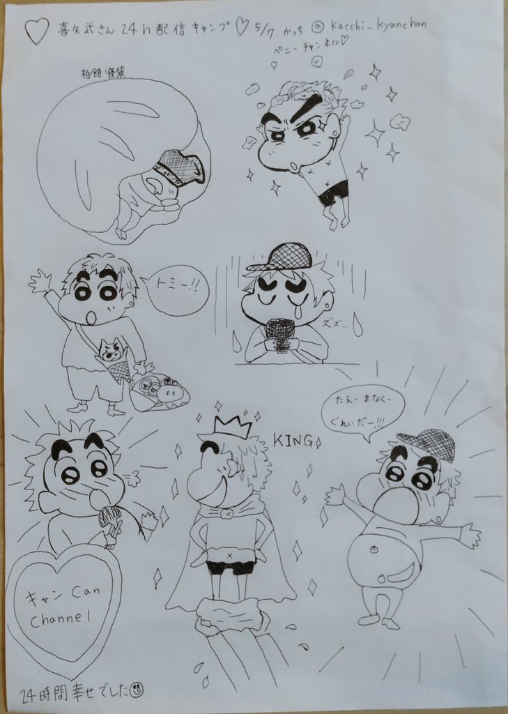 これ描いたらたくさん描きたくなったので、お気に入りのシーンを誇張して描いてみました🤗 きゃんちゃんはずっと可愛かった💕 誰か色塗りしてください #喜矢武さん24h配信キャンプ #喜矢武豊 #キャンCanChannel #ファンアート twitter.com/kacchi_kyancha…